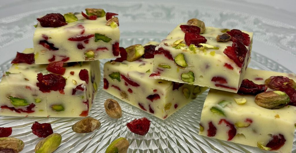 Fudge van witte chocolade, pistache en cranberry’s €2,50 per stuk