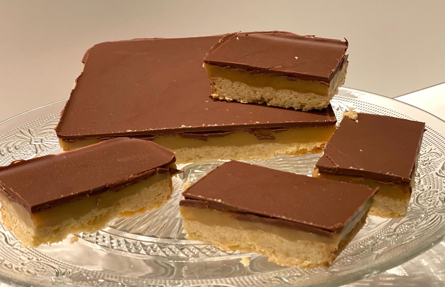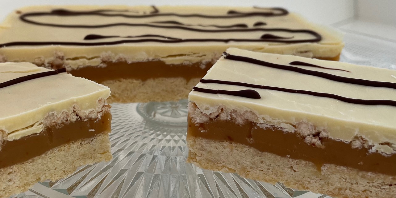 De bodem is gemaakt van een knapperige koek, gevolgd door een rijke laag karamel en als finishing touch een romige laag chocolade bovenop.