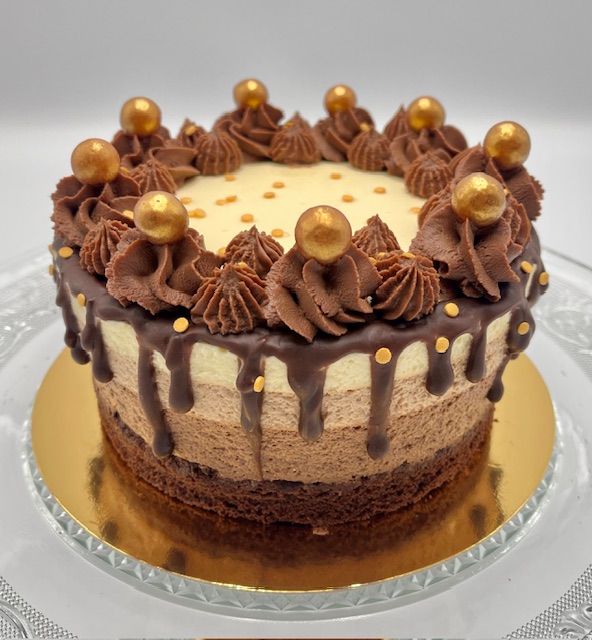 Chocolade trio met een zachte chocolade biscuit, een krokant laagje en drie verschillende mousses.